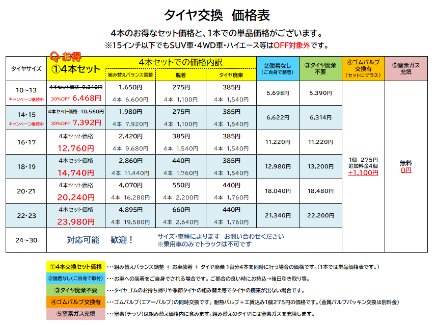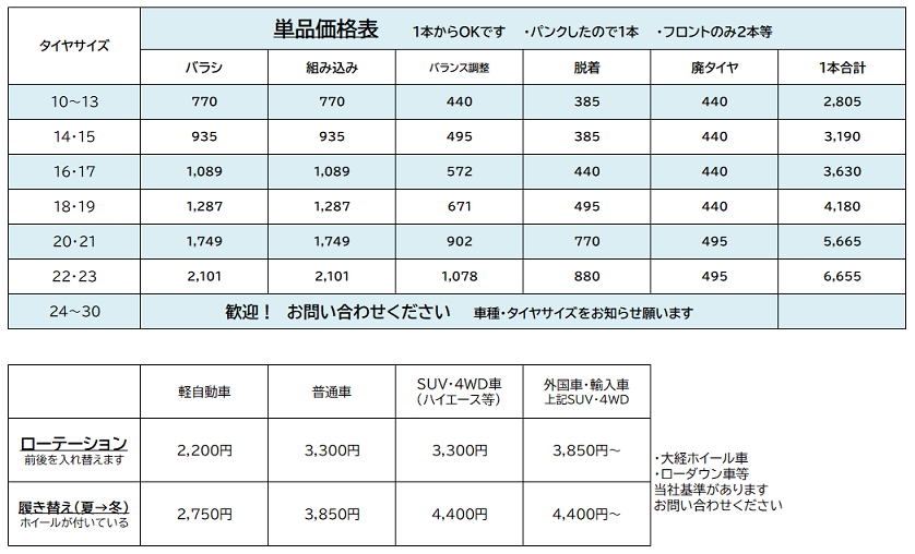 ※外国車、SUV/4WD、ランフラットタイヤ、空気圧センサー装着タイヤなど別途追加料金がかかります